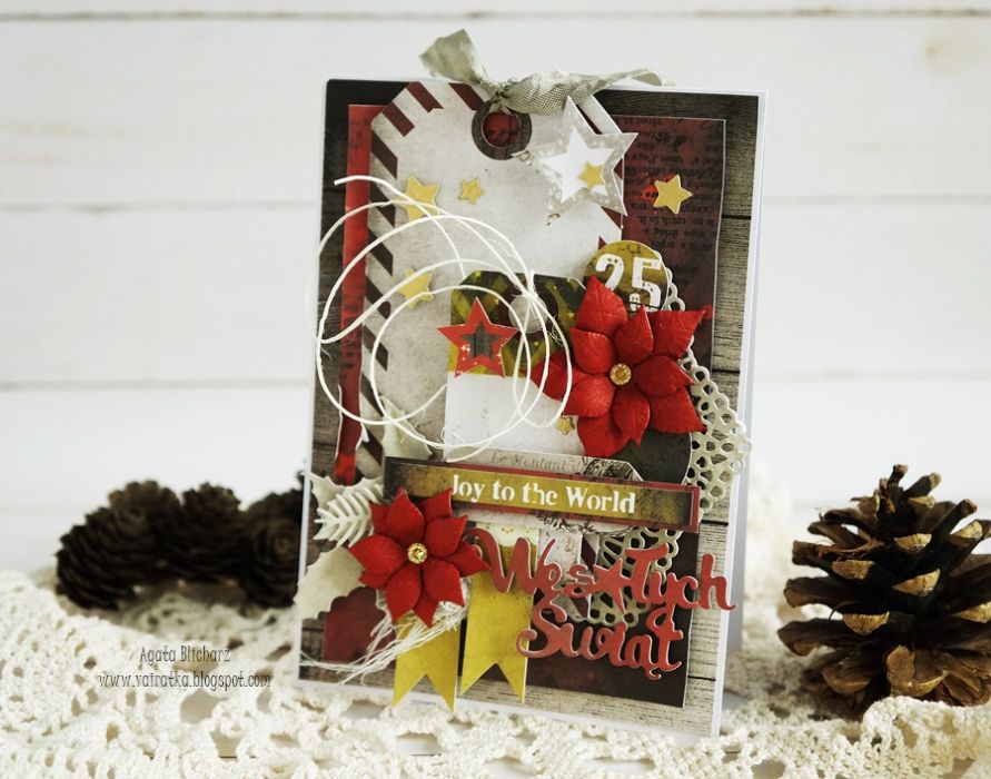 Wyjątkowa kartka świąteczna. Wykonana z najwyższej jakości materiałów do scrapbookingu (polskiego producenta), ozdobiona ręcznie wycinanymi detalami z papieru, podklejonymi kosteczkami 3d, dzięki czemu kartka zyskała przestrzenność. Do tego czerwone poinsecje wykonane ręcznie z papieru czerpanego.