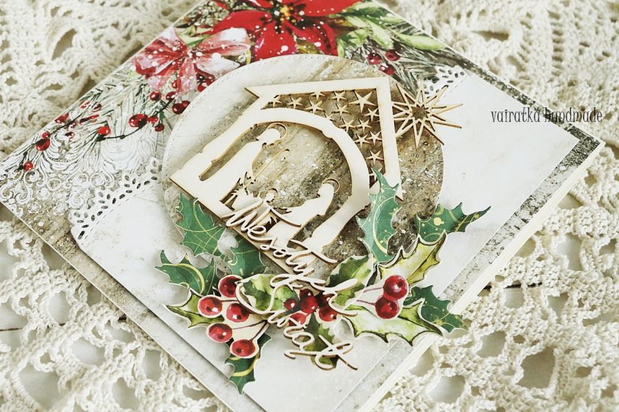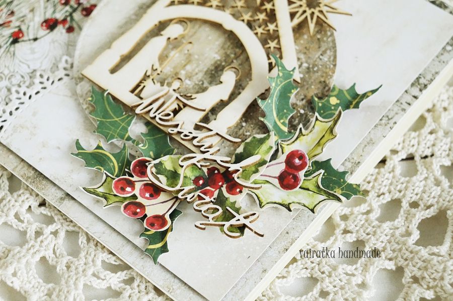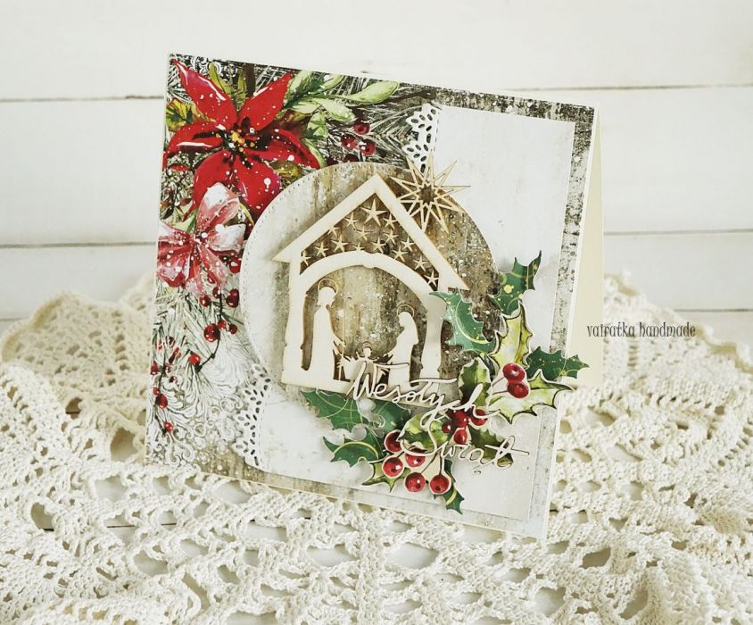 Wyjątkowa kartka świąteczna wykonana z najlepszej jakości materiałów do scrapbookingu, ozdobiona przestrzenną kompozycją ręcznie wycinanych listków i dekoracji świątecznych, w centrum urocza tekturowa stajenka oraz tekturowy napis.