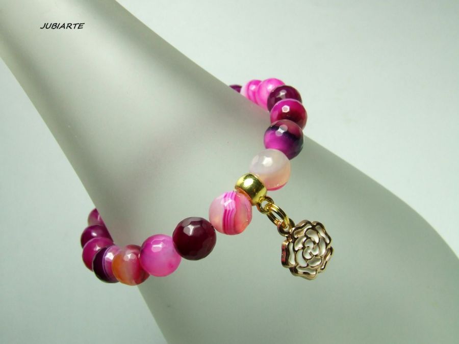 Bransoletka wykonana z pięknych, fasetowanych kul (8 mm) agatu w odcieniach fuksji, różu, purpury i amarantu. Dodatkową ozdobą jest zawieszka w kształcie róży (12 x 12 mm) z metalu w kolorze złota. Całość na elastycznej gumce jubilerskiej.