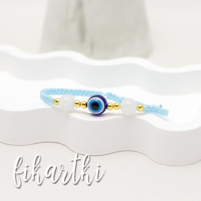 Została wykonana ręcznie na jasnobłękitnym sznurku, który pięknie podkreśla centralny motyw oka Nazara.