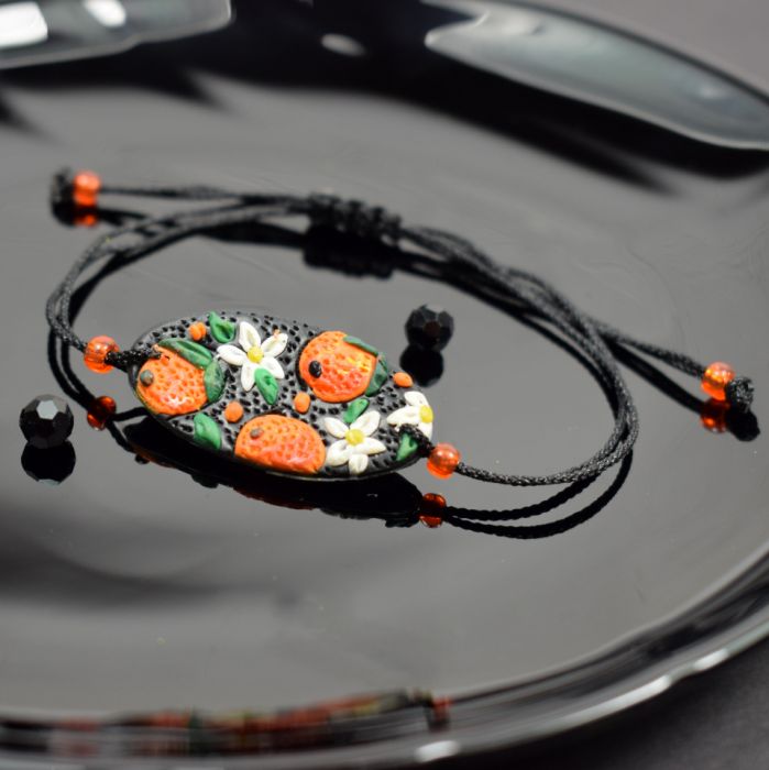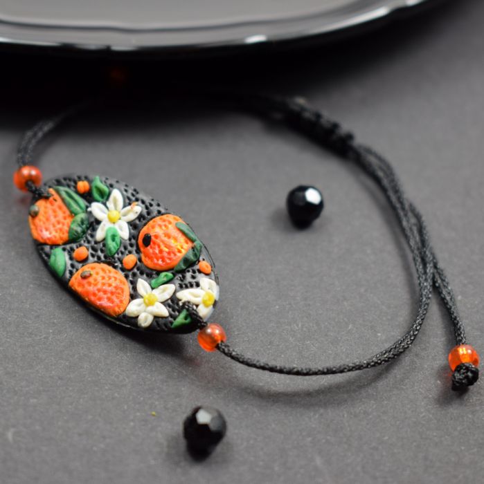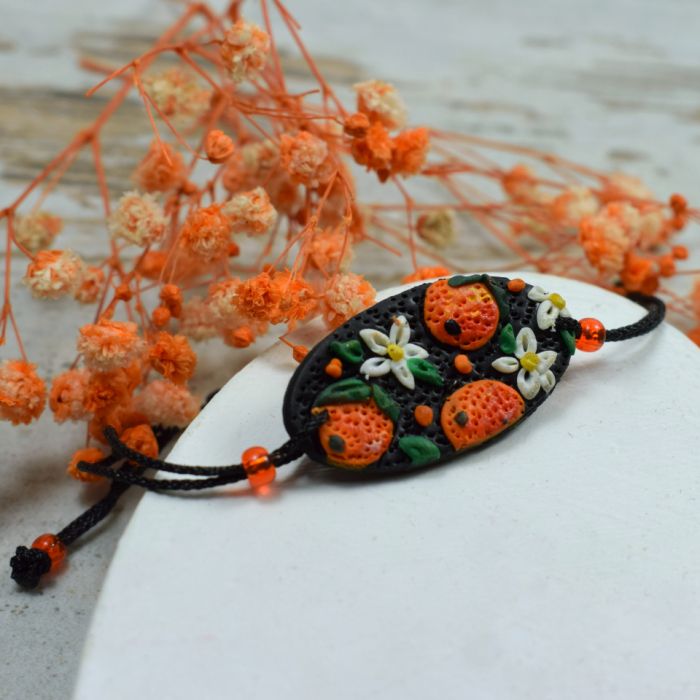 Energetyczna, letnia bransoletka z ręcznie wykonanym elementem ozdobnym z glinki polimerowej, przedstawiającym soczyste pomarańcze. To mała dawka słońca na Twoim nadgarstku — idealna na wakacje, spacer po plaży czy po prostu na poprawę humoru.