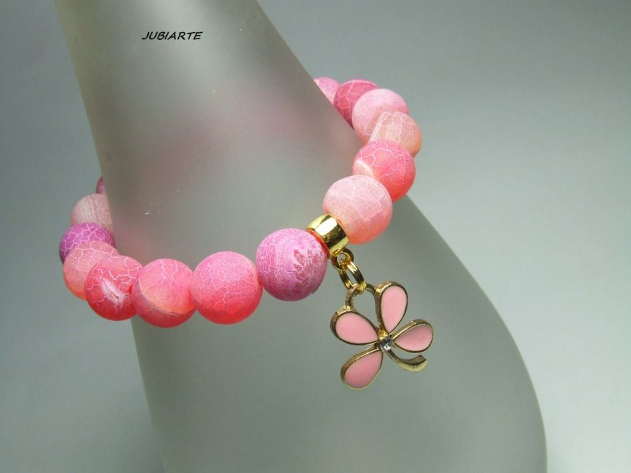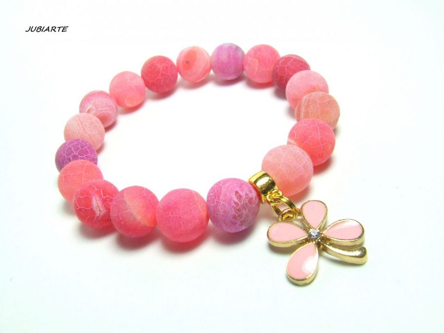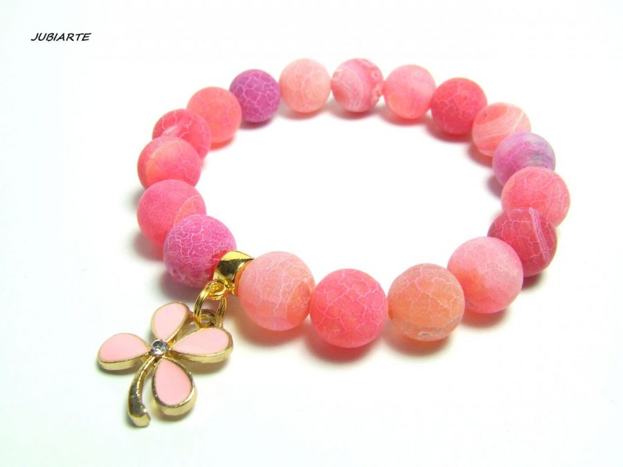 Bransoletka wykonana z pięknych kul (10 mm) agatu trawionego w odcieniach purpury, czerwieni i łososiowym. Dodatkową ozdobą jest zawieszka - kwiatek (18 x 20 mm) z metalu w kolorze złoto-różowym. Całość na elastycznej gumce jubilerskiej.
