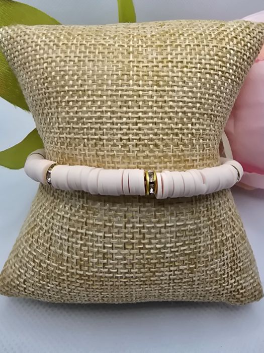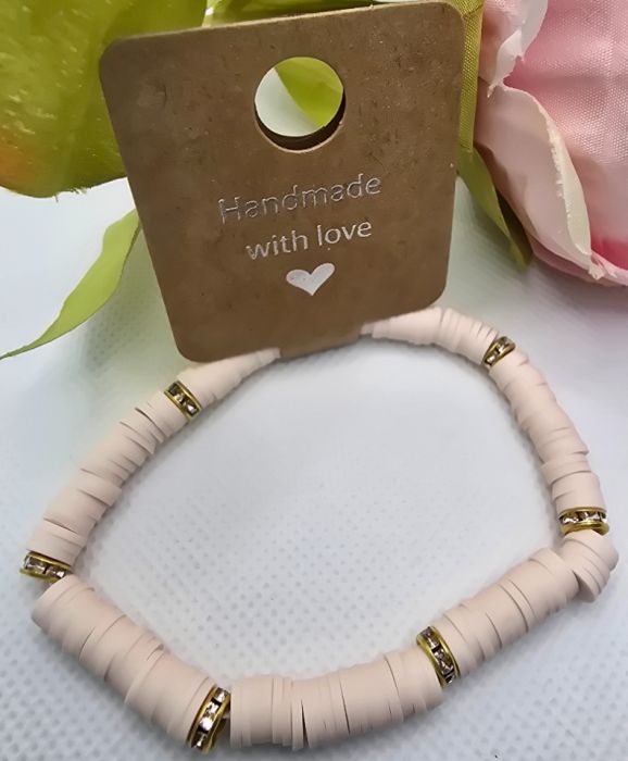 Bransoletka na gumce, wykonana głównie z koralików glinianych, przekładana koralikami w kolorze złotym z cyrkoniami. Najładniej prezentuje się w zestawie 2-3 podobnych bransoletek. Pasuje na nadgarstek 17-18cm