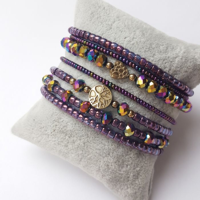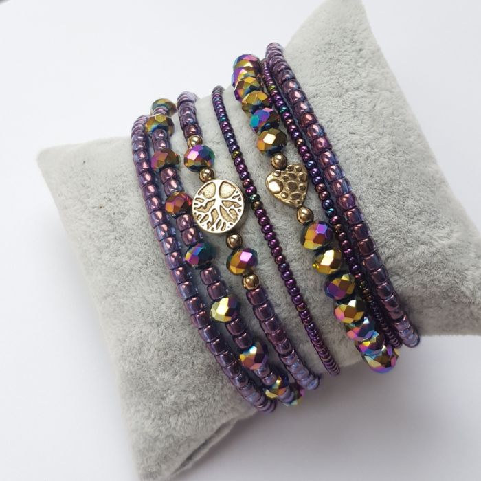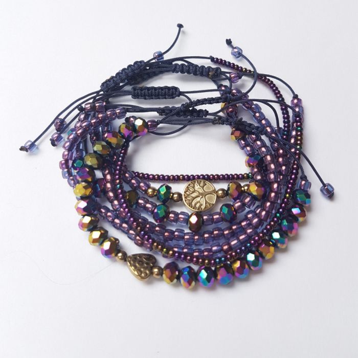 Zestaw siedmiu bransoletek z fioletowych koralików z przekladkami z hematytu w kolorze zlotym. Każdą bransoletkę można nosić oddzielnie lub komponować dowolnie z innymi bransoletkami. Bransoletki zrobione na sznurku jubilerskim, a zapięcie wyplecione ściegiem makramowym co pozwala na regulację objętości, przechodzi przed dłoń 21,5 cm, a zmniejszyć można do 13 cm objętości nadgarstka