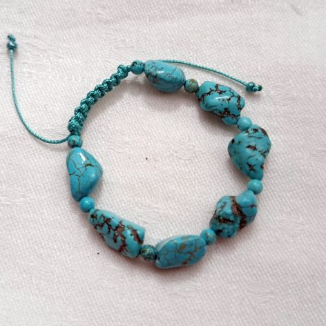 Śliczna bransoletka wykonana z naturalnych nieregularnego kształtu kamieni turkusu makrama za pomocą sznurka bawełnianego lakierowanego.