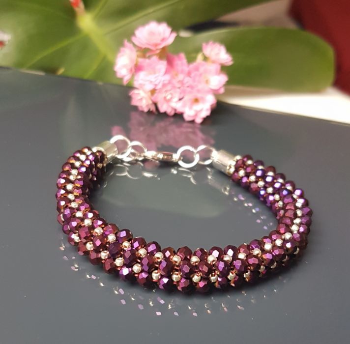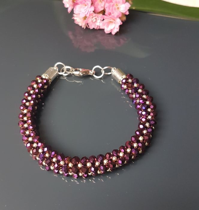 Piekne burgundowe koraliki szlifowane i srebrne maleńkie 2 mm koraliki szklane. Bransoletka w formie wężyka o długości 19-21 cm