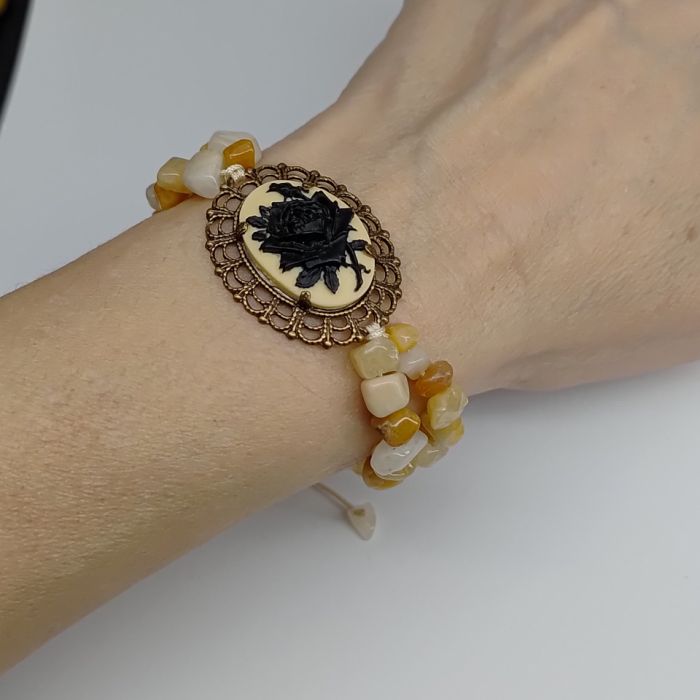 Bransoletka wykonana na sznurku. Klasyczna camea w połaczeniu ze sznurkiem. Czarna róża na kremowym tle w mosiężnej oprawie. Karneol na beżowym sznurku makramy, objętość regulowana od 15-25 cm