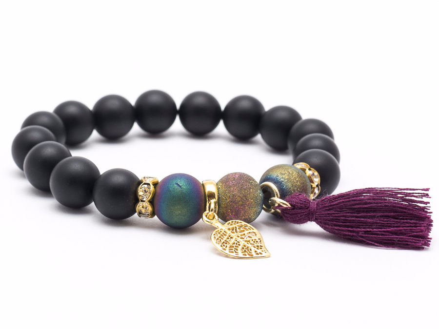 Bransoletka damska wykonana z kamieni naturalnych, onyks mat 10 mm oraz agat tęczowy z druzą 10 mm, zawieszka i mały chwost bawełniany ok. 3 cm.