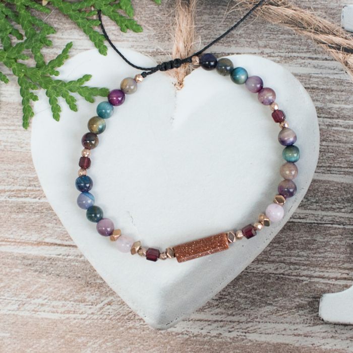 Bransoletka Dla Wysoko Wrażliwej, dla ochrony i szczęścia. Rozmiar uniwersalny, regulowana. Wykonana ze starannie wyselekcjonowanych minerałów o średnicy 3 i 4 mm: tygrysie oko multikolor, opal peruwiański, hematyty, granaty, piasek pustyni, mocnego czarnego sznureczka z przesuwnym zapięciem makramowym. Dodatkowo w bransoletce zakodowana jest szczęśliwa liczba 7 – w postaci siedmiu węzełków.