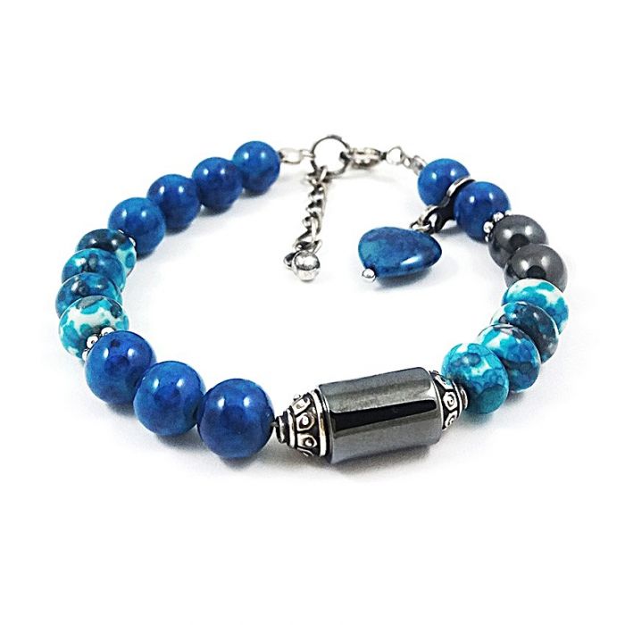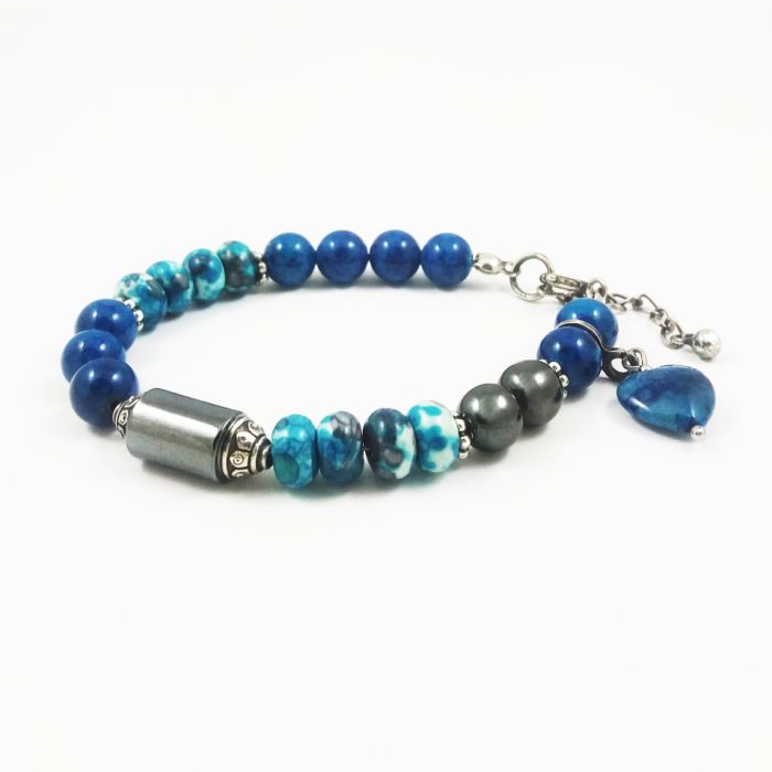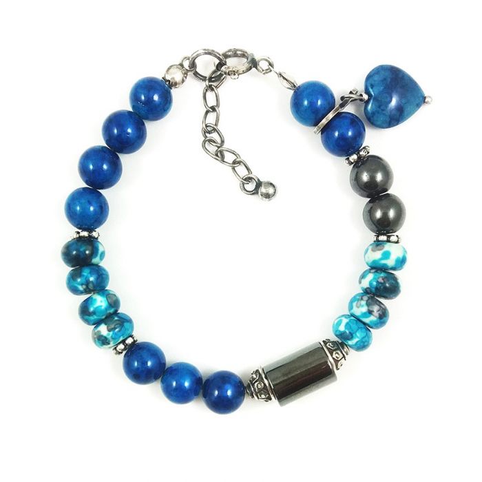 Efektowna, srebrna bransoletka z gładkich kulek marmurku, w pięknym granatowym kolorze, grafitowych kulek hematytu, oponek kwiatowego howlitu i wałeczka z grafitowego hematytu.