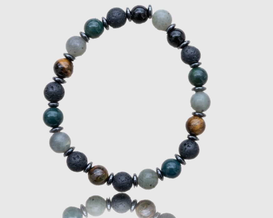 Elastyczna gumka i kamienie: onyks, agat, hematyt, tygrysie oko, lawa.