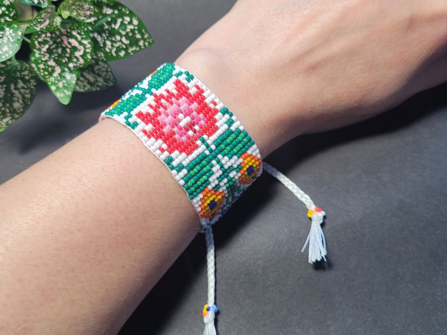 Bransoletka z wielobarwnymi kwiatami na białym tle, inspirowana tradycyjnym polskim motywem etnicznym wytkana na krosnie z koralików czeskich Preciosa.