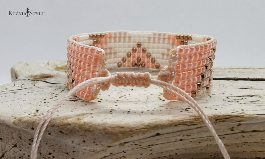 Bransoletka ręcznie wykonana na krośnie ze szklanych koralików Toho 11/0 w kolorze koralowo -złoto - białym. Kolory w rzeczywistości mogą się lekko różnić. Zapięcie regulowane, na końcach sznureczków kuleczki metalowe. Szerokość bransoletki 1,7 cm. Pasuje na nadgarstek od 14-15 cm.