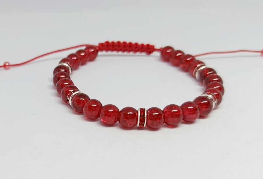 Śliczna bransoletka wykonana ze szklanych koralików w kolorze czerwonym o średnice 6 mm z efektem crackle - to efekt spękana charakterystyczny dla kryształu górskiego, metalowych przekładek z kryształkami szklanymi w kolorze czerwonym oraz sznurków jubilerskich nylonowych ręcznie metodą wiązania sznurków - makrama.