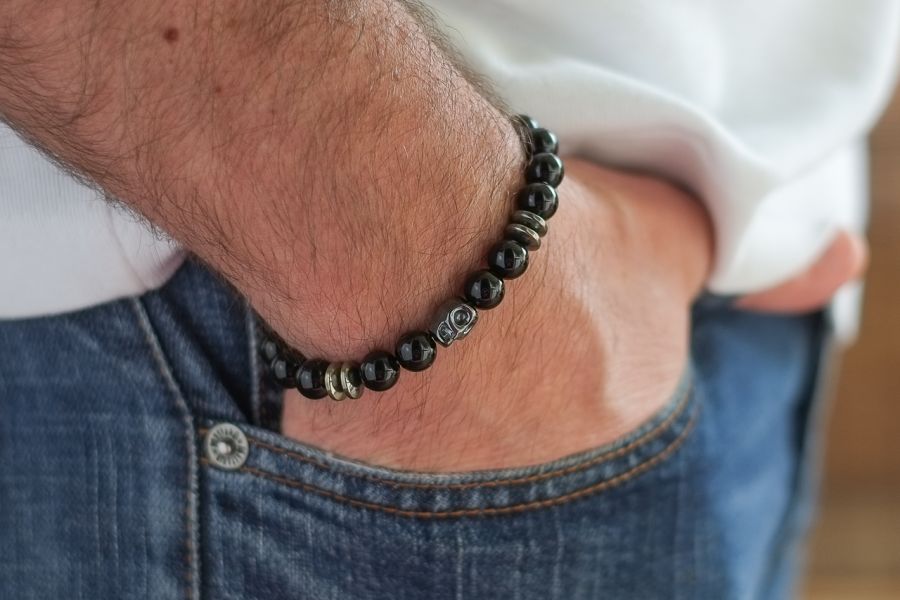 Bransoletka męska wykonana z kamieni naturalnych, onyks błysk 8 mm oraz hematyt czaszka. Elegancka i delikatna zarazem.