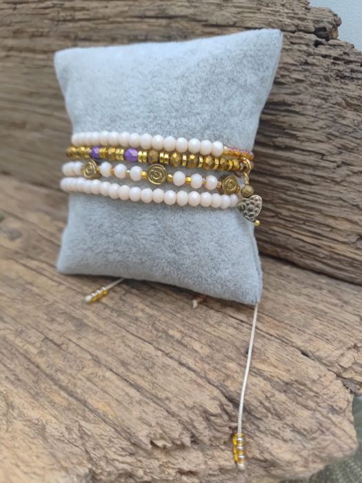 Bransoletka na sznurku syntetycznym. Koraliki oponki szklane fasetowane nude, złote drobne koraliki i przekładki z hematytu, różyczki i serduszko zawieszka. Sznurek pozwala na dopasowanie, największy obwód 20 cm