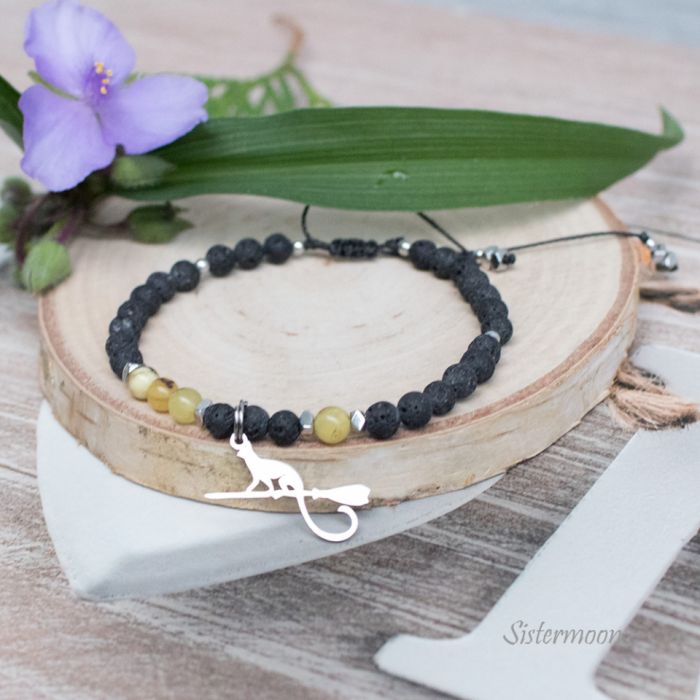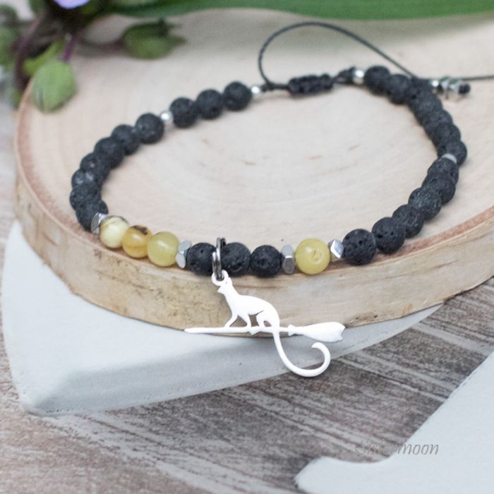 Bransoletka ochrona z kotem i minerałami. Pełna mocy i z ukrytym znaczeniem. Bransoletka wykonana ze starannie dobranych minerałów: lawa wulkaniczna, bursztyn, hematyty o średnicy 2 i 4 mm.