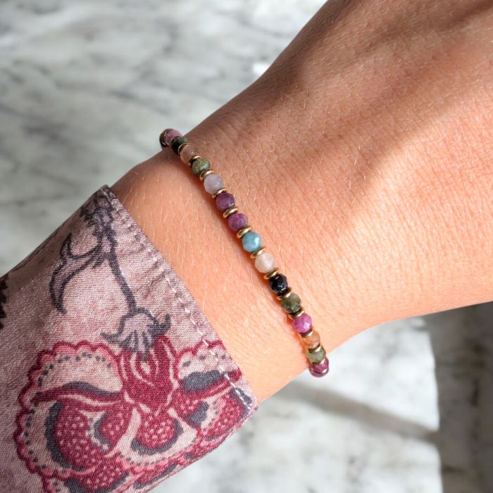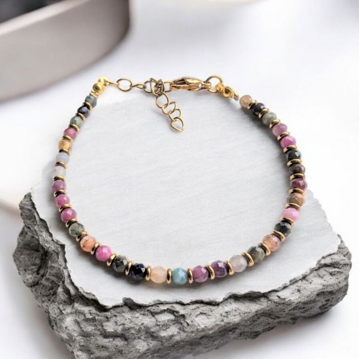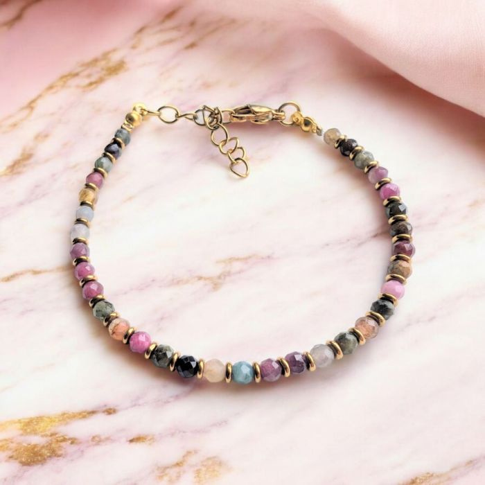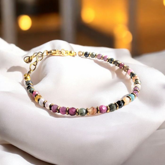 Ręcznie wykonana bransoletka z kamieni naturalnych: kolorowy turmalin i złoty hematyt. Zapięcie ze stali szlachetnej.
