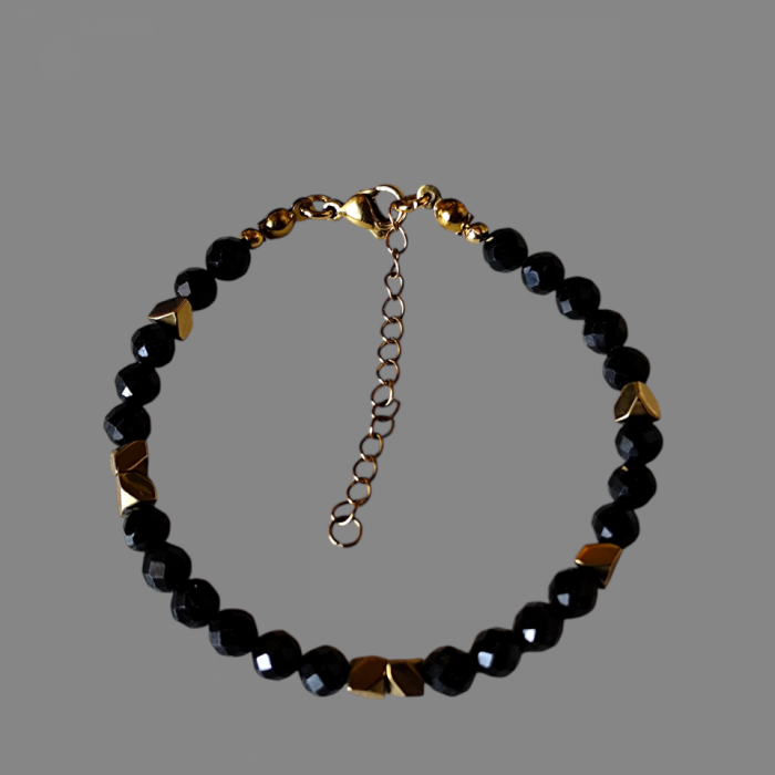Odkryj biżuterię, która łączy w sobie surową elegancję natury z niezawodną trwałością. Ta wyjątkowa bransoletka została stworzona dla kobiet ceniących bezpieczeństwo i ponadczasowy styl. Głęboka, aksamitna czerń fasetowanych kulek turmalinu przeplata się ze złotymi akcentami o geometrycznych kształtach, tworząc kompozycję pełną klasy.