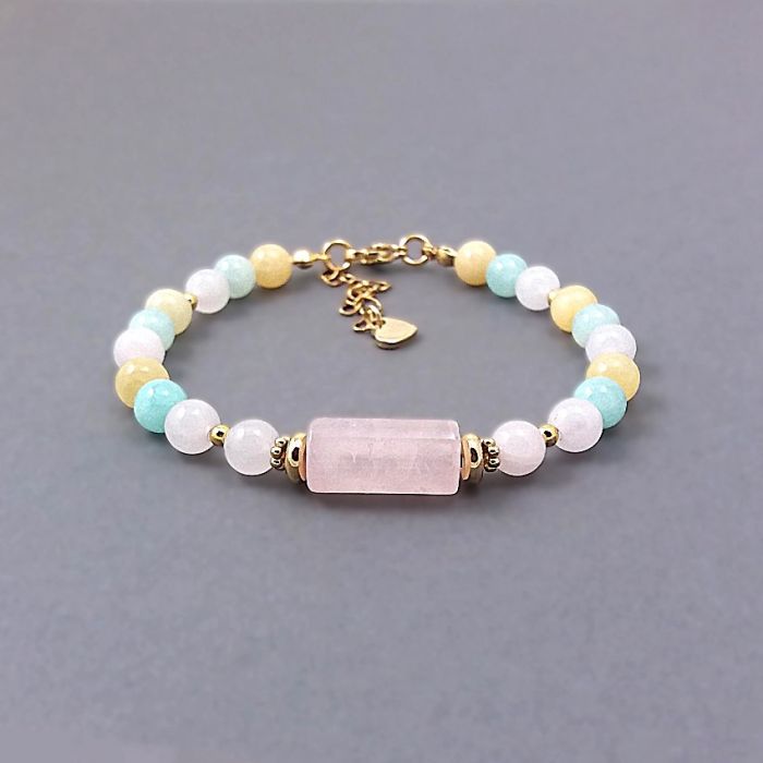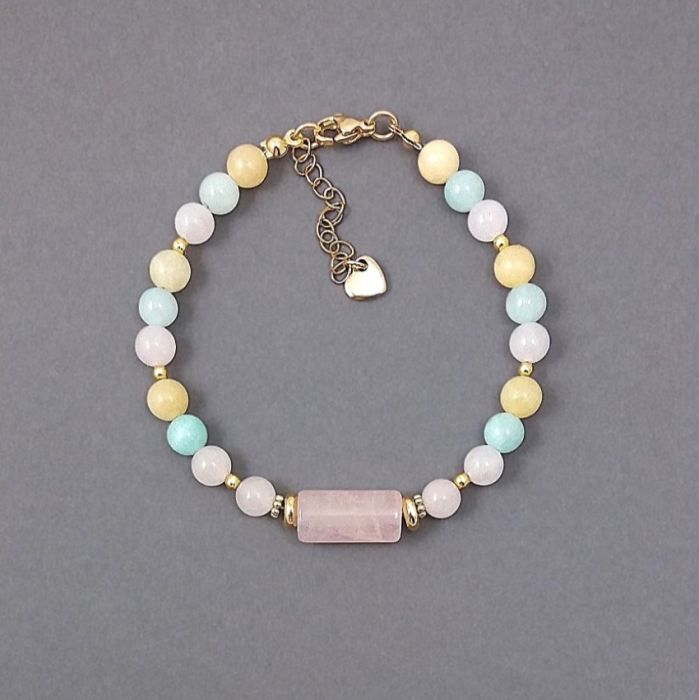 Pastelowa bransoletka z kamieni półszlachetnych: gładkich kulek kwarcu różowego, seledynowego jadeitu i żółtego topazu. Kamienie mają średnicę 6mm. Centralnie umieściłam walec z różowego kwarcu, o wymiarach 8 x 17mm.