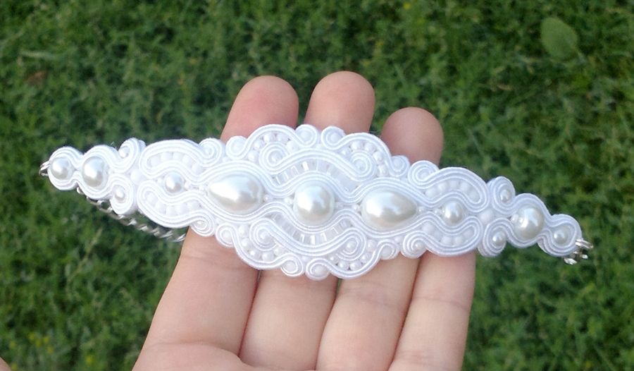 Piękna, perłowa bransoletka została wykonana ręcznie pracochłonną techniką haftu sutasz.