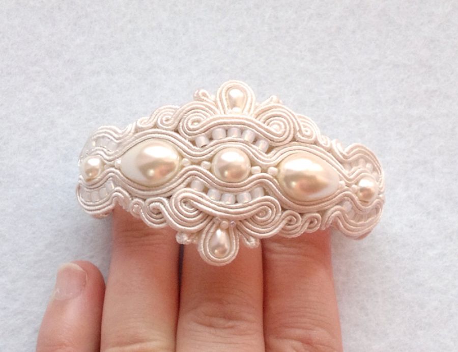 Piękna, perłowa bransoletka została wykonana ręcznie pracochłonną techniką haftu sutasz.