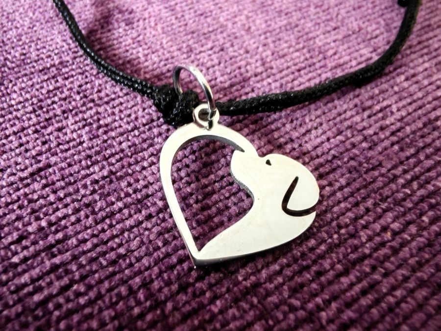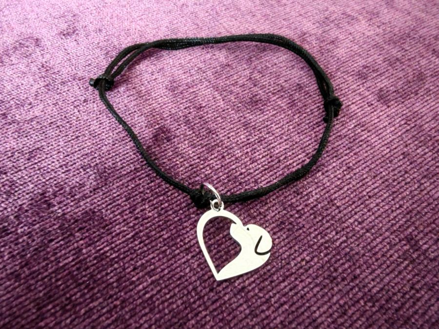 Bransoletka wykonana z nylonowego, trwałego, miłego w dotyku sznurka w kolorze czarnym z zawieszką w kształcie serca, w którą wpisany jest pies.