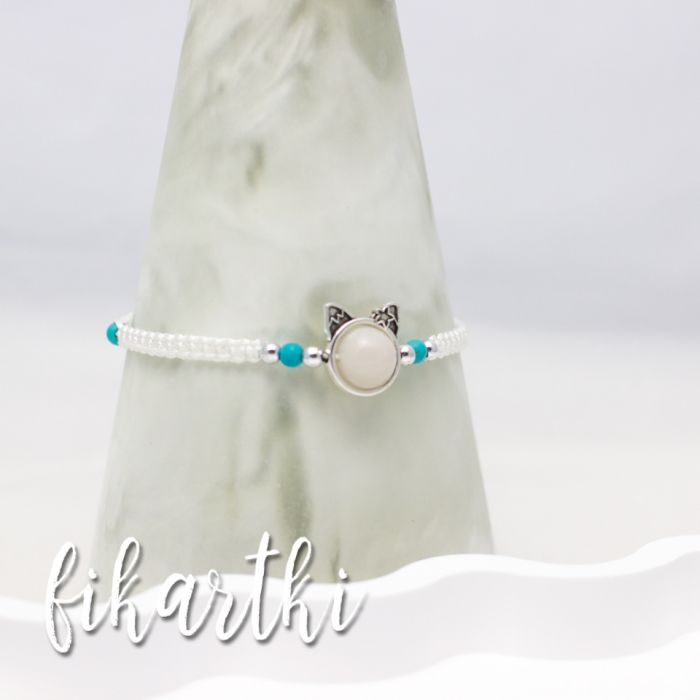 Centralnym punktem biżuterii jest mlecznobiały kamiń oprawiony w srebrzystą formę z kocimi uszkami, który nadaje całości wyjątkowego charakteru.