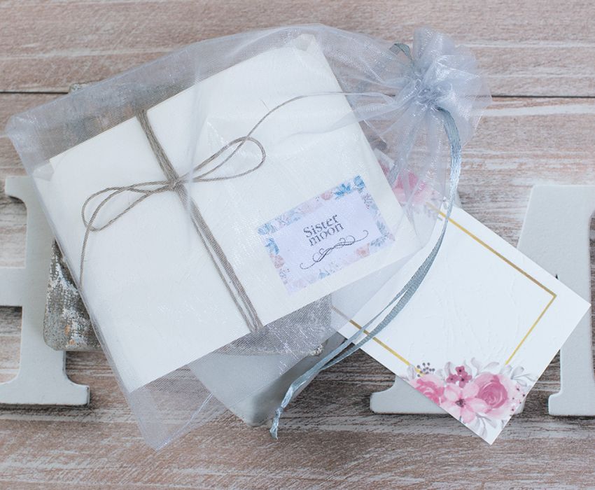 Opakowanie standardowe: karta produktowa z opisem, kartonowa kopertka, woreczek z organzy.