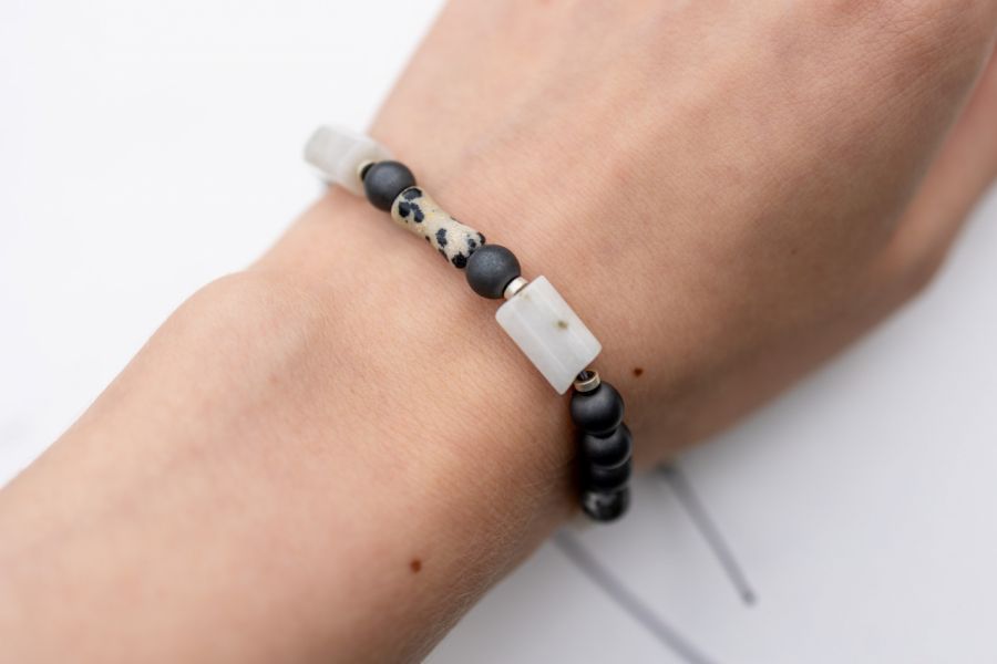 Nazwa produktu: Bransoletka ‘Equilibrium’ z naturalnym kamieniem (kamień księżycowy, amazonit, jaspis dalmatyński i hematyt) na czarnym sznurku