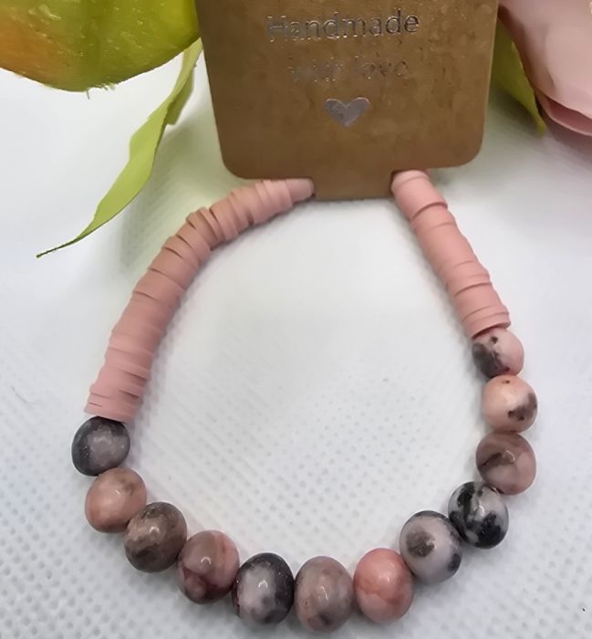 Bransoletka na gumce, wykonana z koralików glinianych i akrylowych. Najładniej prezentuje się w zestawie 2-3 podobnych bransoletek. Pasuje na nadgarstek 17-18cm