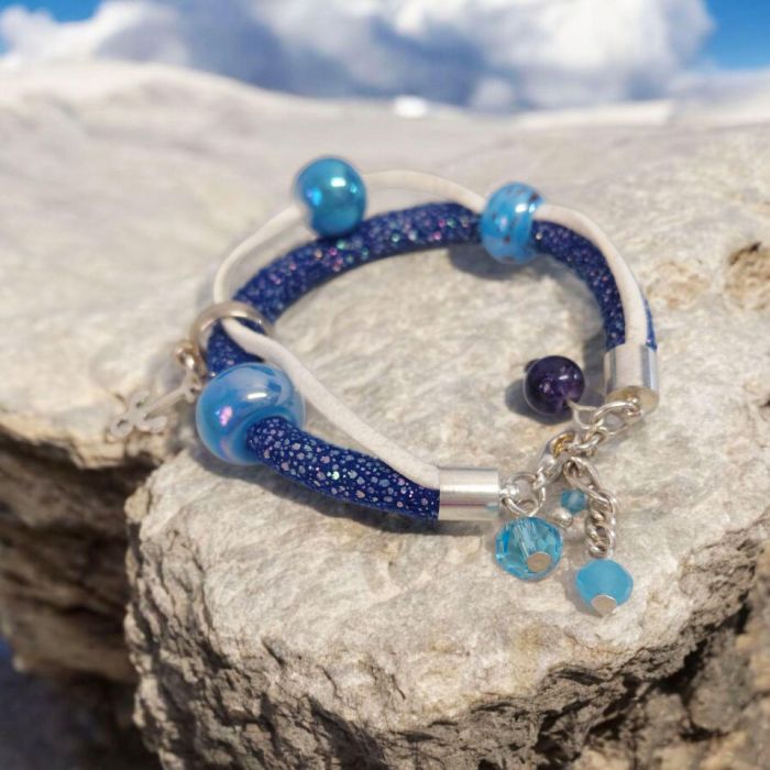 Rzemyki skórzane, koraliki szklane, ceramiczne lub akrylowe w rozmiarach 8-12mm. Elementy metalowe, posrebrzane lub w kolorze złota, antyalergiczne.