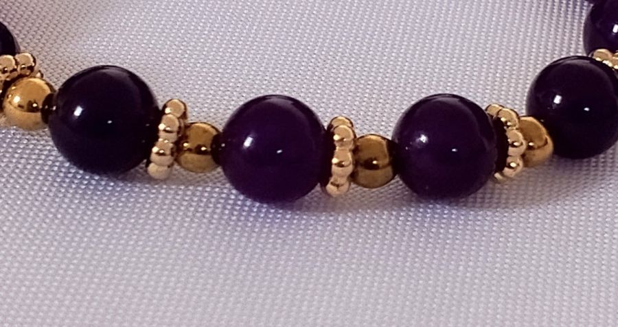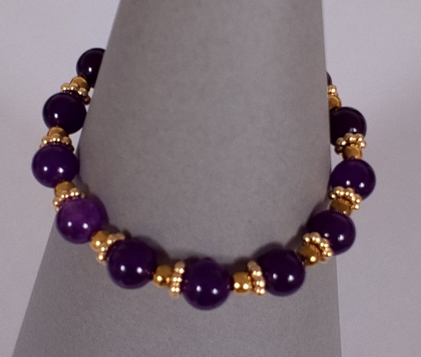 Bransoletka wykonana z kulek ametystu o średnicy 8mm i kulek pozłacanego hematytu o średnicy 4 mm .Nosnikiem jest złota nić jubilerska .