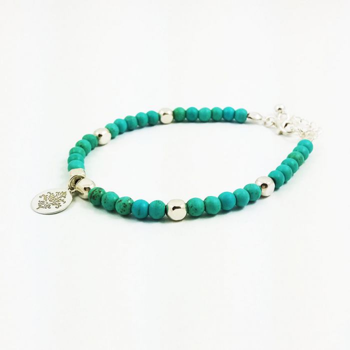 Delikatna, srebrna bransoletka z gładkich kulek turkusowych (jasno niebieskich) howlitów, srebrnych przekładek-zaoblonych kostek i srebrnej zawieszki z folkowym motywem. Kamienie mają średnicę 4 mm, a zawieszka 9 mm.