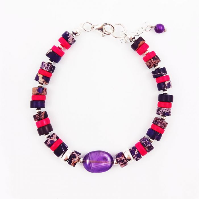 Dekoracyjna, srebrna bransoletka z krążków fioletowego jaspisu i ciemno różowego howlitu. Kamienie mają średnicę 6 mm. Centralnie umieściłam owalną, gładką bryłkę ametystu, pięknie odbijającą światło.