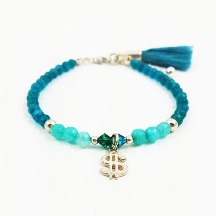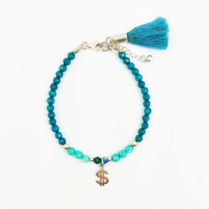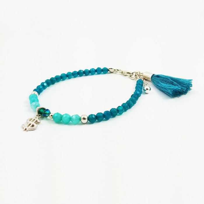 Delikatna, srebrna bransoletka z fasetowanych kulek jadeitu w pięknych kolorach jasnego i ciemnego turkusu, srebrnych przekładek, kryształków bicone w pasującym, opalizującym kolorze i zabawnej srebrnej zawieszki w kształcie dolara. Kamienie mają średnicę 4 mm.