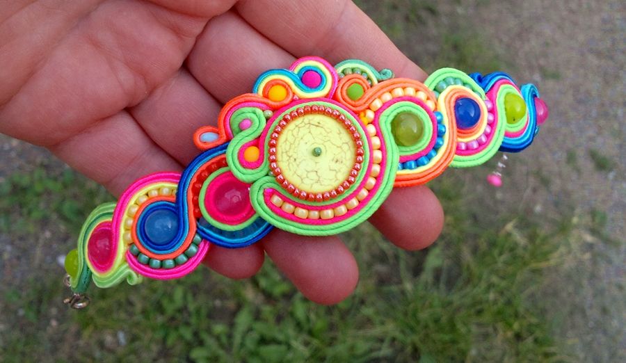 Przepiękna bransoletka została wykonana ręcznie pracochłonną techniką haftu sutasz w nasyconych NEONOWYCH kolorach tęczy.