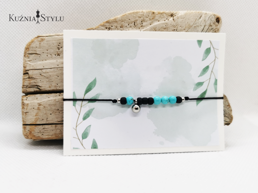 Bransoletka wykonana z małych naturalnych kamieni turkusa i matowych czarnych koralików szklanych. Zawieszka i małe kuleczki w kolorze srebrnym wykonane są ze stali szlachetnej. Koraliki w kształcie kulki o średnicy 4 mm nawleczone są na nylonowy czarny sznurek. Zapinana jest na tzw. zapięcie makramowe, regulowane. Pasuje na rękę 16 - 18 cm.