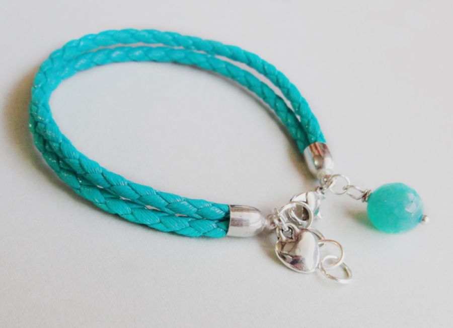 Świetna, wygodna, miękka bransoletka z syntetycznego rzemyka. Ozdobiona serduszkiem i jadeitem. Na nadgarstek 14,5-18 cm.