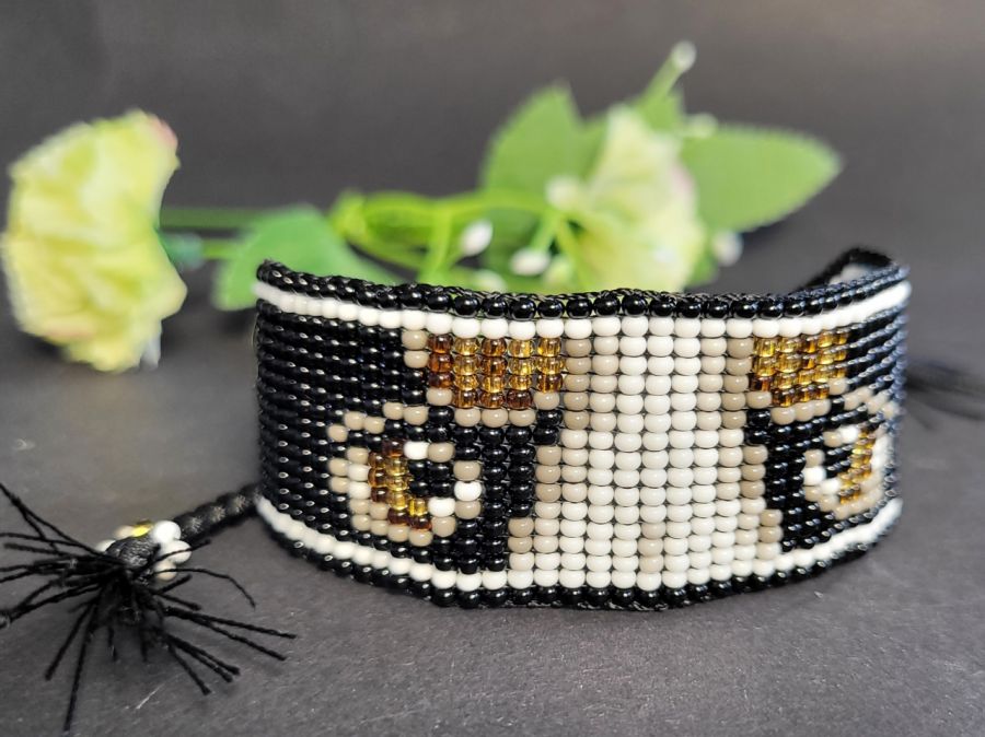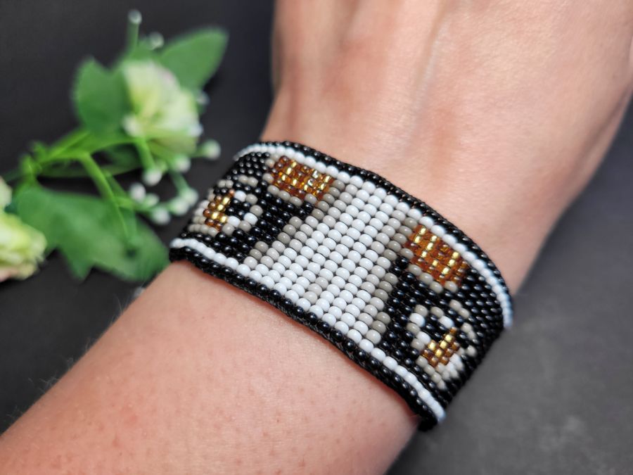 Wlasnoręcznie utkana na krosnie z koralików czeskich Preciosa bransoletka uniseks z oczami Berneńskigo psa pasterskiego.