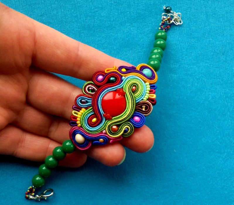 Przepiękna bransoletka została wykonana ręcznie pracochłonną techniką haftu sutasz w nasyconych kolorach tęczy.