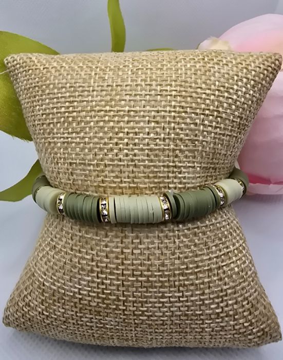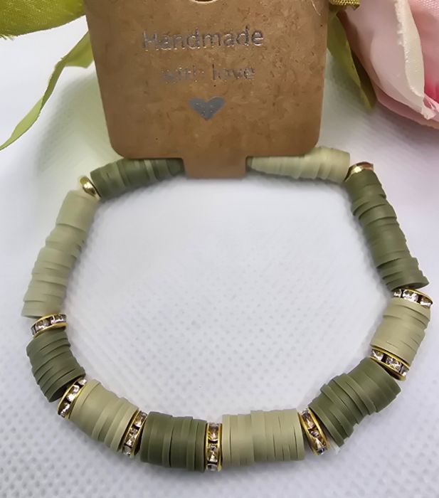 Bransoletka na gumce, wykonana głównie z koralików glinianych, przekładana koralikami w kolorze złotym z cyrkoniami. Najładniej prezentuje się w zestawie 2-3 podobnych bransoletek. Pasuje na nadgarstek 17-18cm