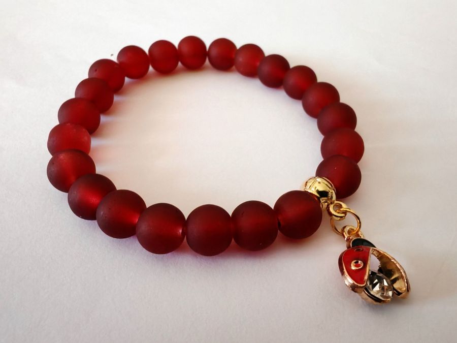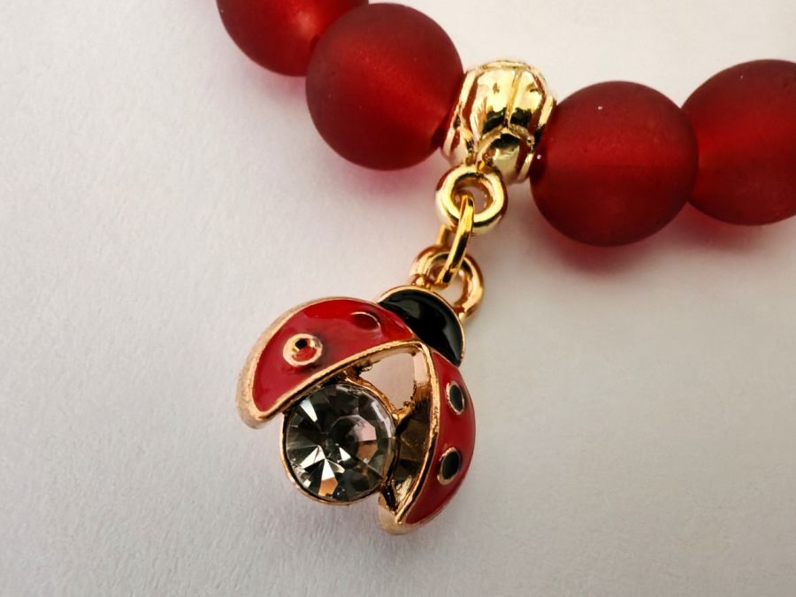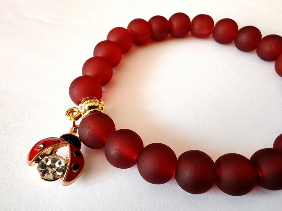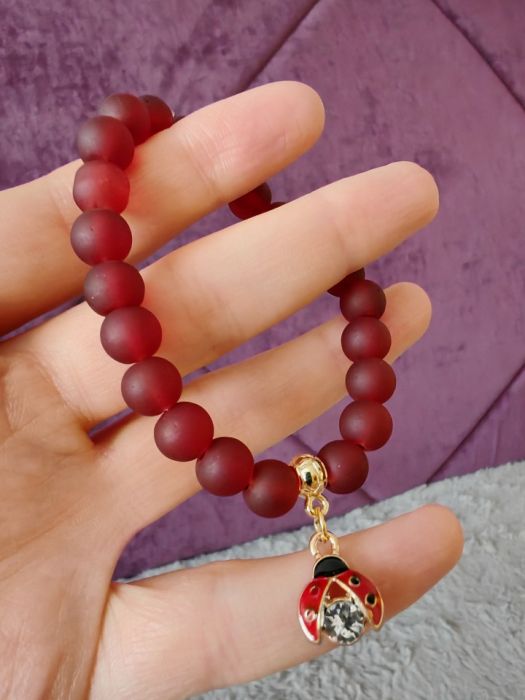 Bransoletka ze szklanych, mrożonych koralików "Gwiezdny pył" (rozmiar 8 mm) w kolorze ciemnoczerwonym. Ozdobiona uroczą zawieszką w kształcie biedronki (również ozdobiona cyrkonią).