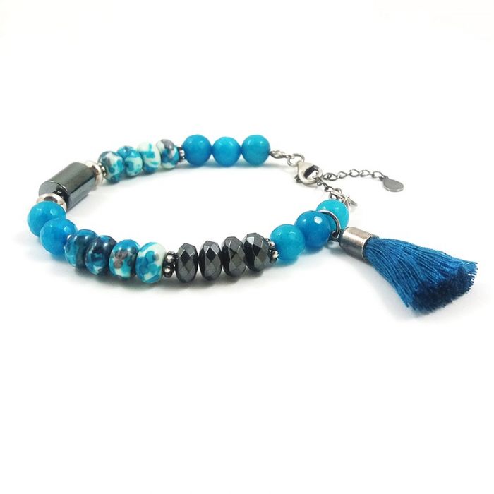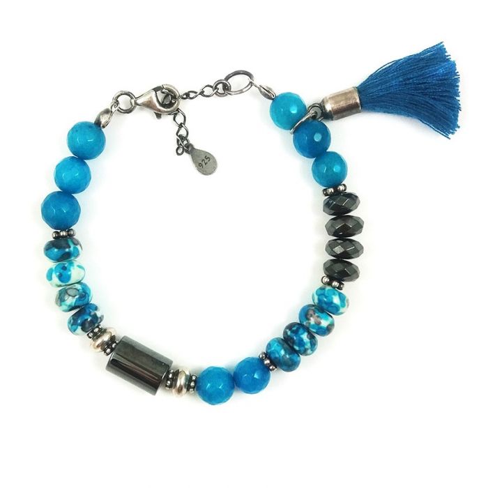 Srebrna bransoletka z fasetowanych kulek jadeitu, w nieoczywistym kolorze ciemnego turkusu, gładkich oponek kwiatowego howlitu, fasetowanych oponek grafitowego hematytu i takiegoż wałeczka. Kamienie mają średnicę 8mm.
