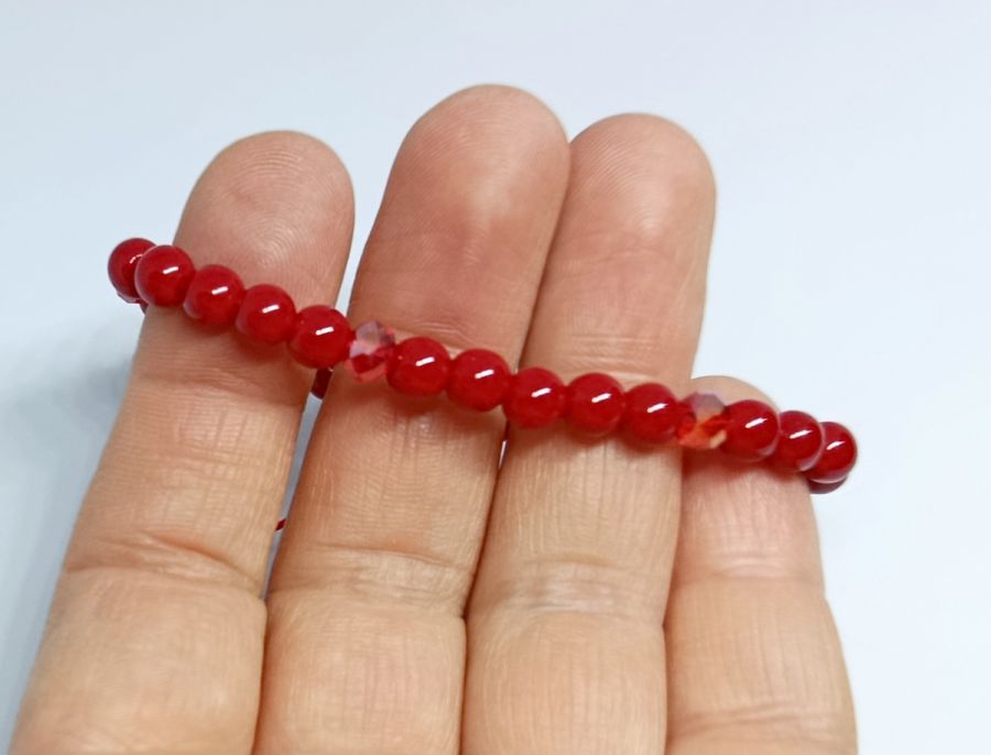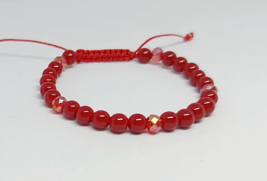 Śliczna bransoletka wykonana z naturalnych kamieni Czerwony Koral z dodatkiem kryształów szklanych w kolorze czerwonym, metalowych przekładek w kolorze złotym oraz sznurków jubilerskich nylonowych ręcznie metodą wiązania sznurków - makrama.