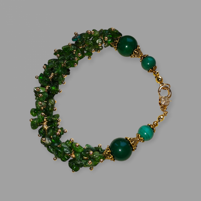 Wyjątkowa, ręcznie wykonana bransoletka, która łączy w sobie intensywną zieleń cennych kamieni naturalnych z eleganckimi, złotymi akcentami.