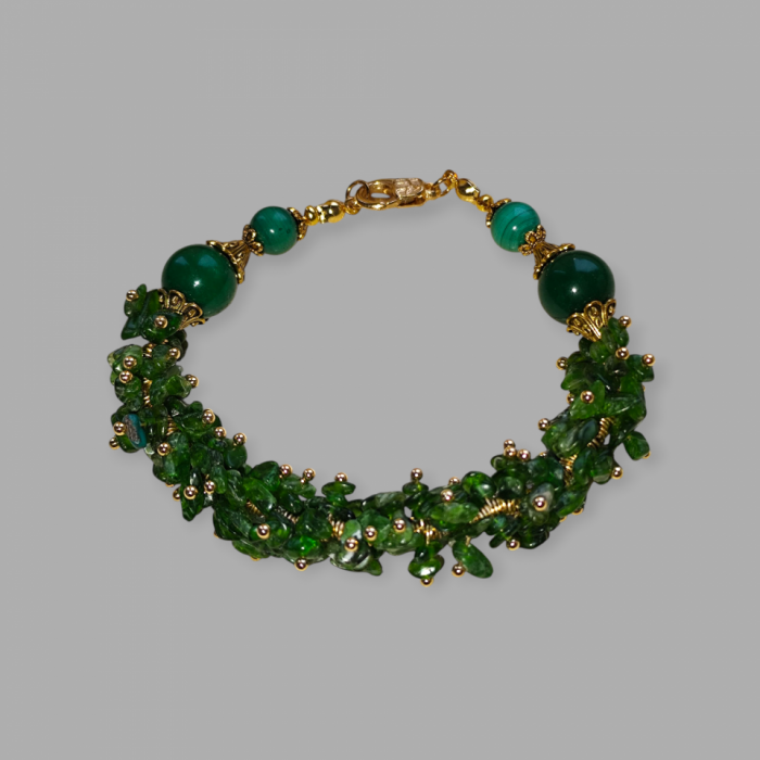 Głównym elementem są efektowne, nieregularne bryłki Diopsydu chromowego, które tworzą bogaty, pleciony warkocz na nadgarstku. Kompozycję dopełniają starannie wyselekcjonowane, polerowane kule Jadeitu oraz intrygujące, wzorzyste koraliki Malachitu. Całość została nawleczona na podwójną linkę jubilerską, co zapewnia trwałość i bezpieczeństwo noszenia, oraz wykończona solidnym, złoconym zapięciem typu karabińczyk.