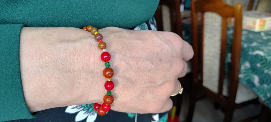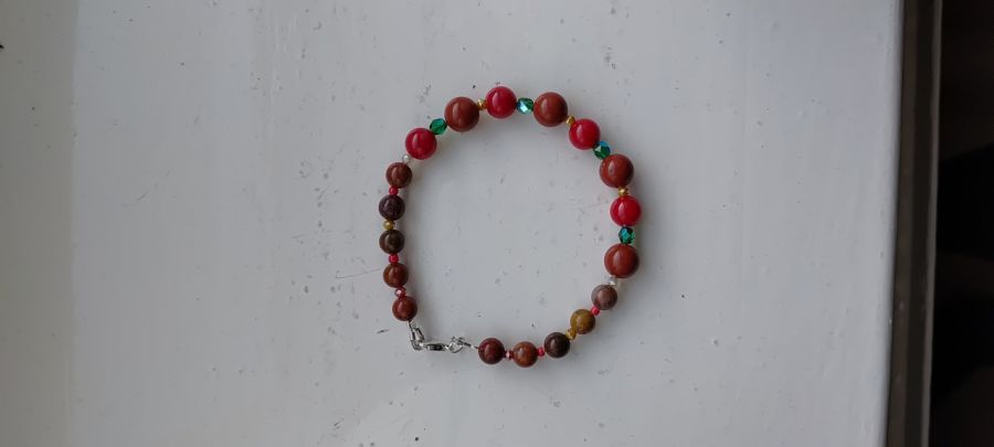 Ta unikatowa bransoletka została wykonana ręcznie z naturalnych kamieni półszlachetnych: agatu, jaspisu oraz koralowca czerwonego. Połączenie ciepłych, ziemistych barw z żywą czerwienią tworzy harmonijną i energetyczną kompozycję, idealną dla osób ceniących sobie naturę, elegancję i indywidualny styl.
