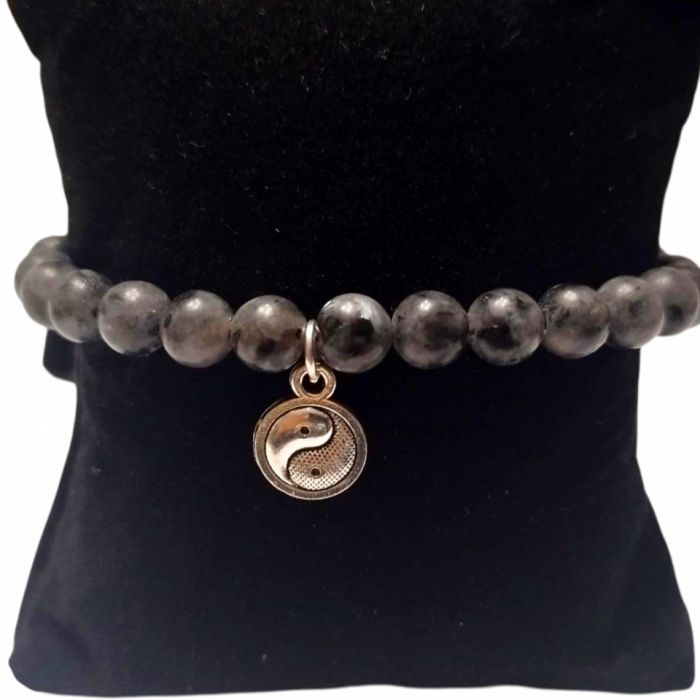 Bransoletka na gumce wykonana z kulek kamieni labradorytu w rozmiarze 6mm, Każdy kamyczek labradorytu to odcienie szarości z czernią. Bransoletka została ozdobiona zawieszką.