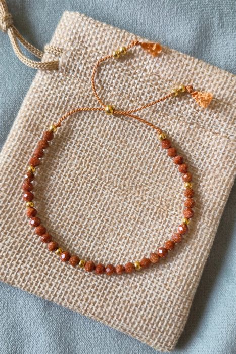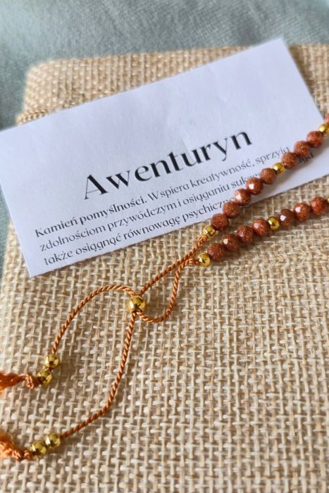 Bransoletka wykonana jest na nici jedwabnej o grubości 0,8mm. Na nici nawleczone są kamienie naturalne - awenturyn. Bransoletka jest regulowana, zapięcie to silikonowy zacisk.